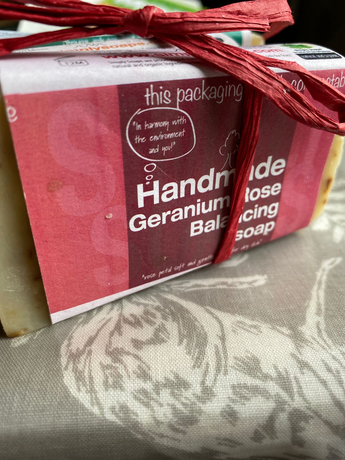 Geranium essential oil has a sweet, floral aroma the scent of this soap helps restore ones equilibrium. A soothing pure aromatherapy soap suitable for all skin types. The soap is 100% biodegradable and the packaging is compostable.